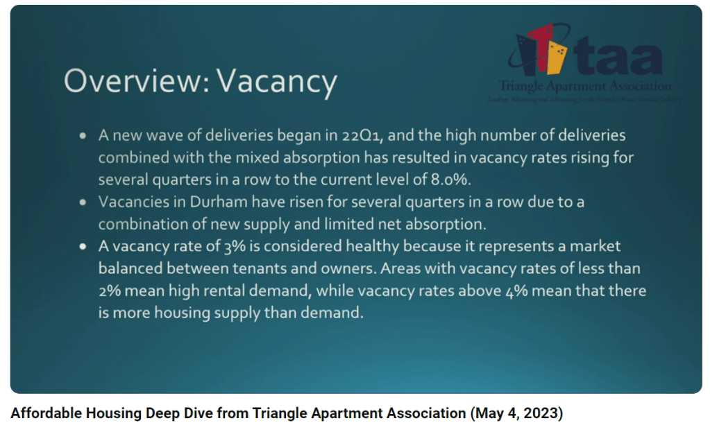 As the Triangle Apartment Association representative testified at last year’s Deep Dive into Affordable Housing, a 3% vacancy rate is ideal and a 4% rate signifies more supply than demand. 9.5% is irrefutably an excess of available housing.