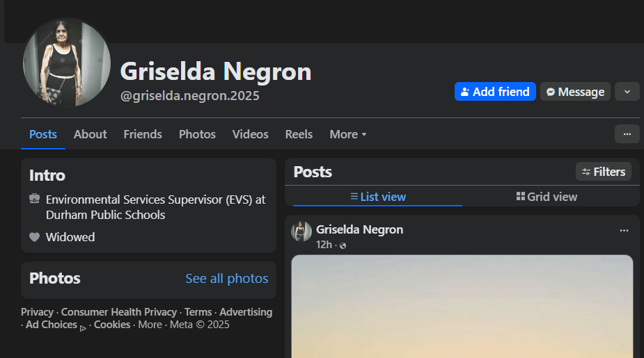 If you don’t have your reading glasses on, Griselda’s profile says she is an Environmental Services Supervisor (EVS) at Durham Public Schools. She includes a profile picture.